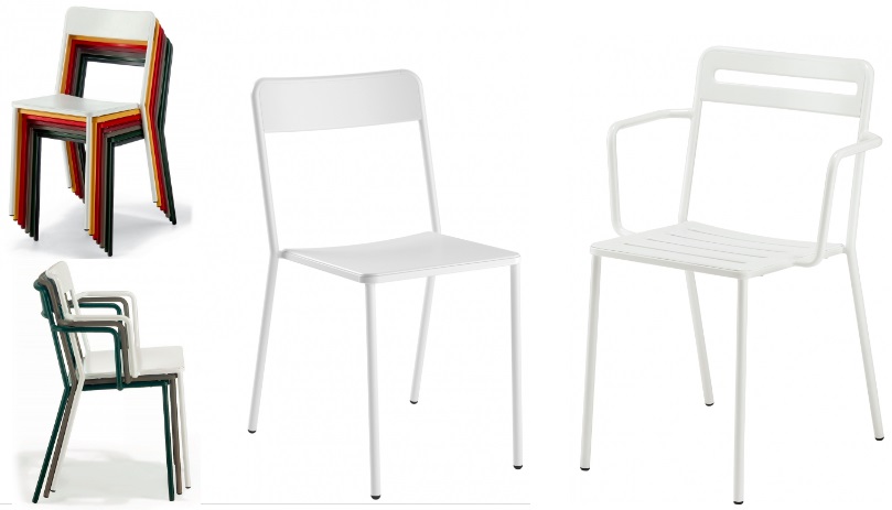 Disponible en cinco acabados, el asiento de acero también se puede elegir en la versión con brazos (Villa 2) o como taburete (Villa 3A).