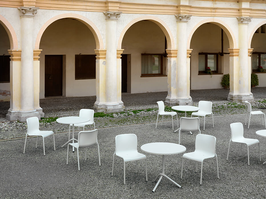 QU es una mesa minimalista y discreta, concebida principalmente para entornos al aire libre: la estructura de tubo metálico es de hecho autonivelante, por lo que es adecuada para colocar incluso en superficies algo irregulares. Es adecuada para ser colocada fácilmente en jardines, balcones y terrazas en la calle, así como en ambientes con pavimentos que no son totalmente planos.