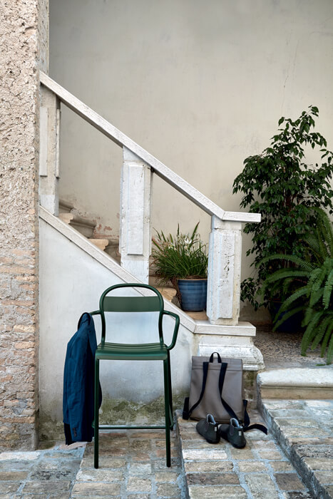 El respaldo del taburete, en la reconocible rejilla metálica, se ha rebajado respecto a las versiones de silla, para volverlo más práctico y de apariencia más ligera. Aunque es un producto orientado al uso en exteriores, gracias a su elegancia innata también se adapta perfectamente a ambientes interiores.