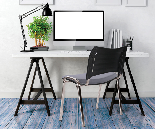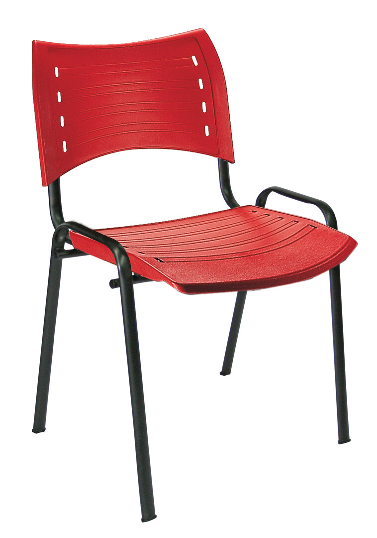 Estructura: de acero tubular ovalado de 30 x 15 mm, calibre 18; con acabado de pintura epóxica (electrostática) color negro mate. parrilla: en perfíl pulido redondo de acero en 3/16 "de diámetro. asiento y respaldo: en dos piezas en polipropileno de alta resistencia y duración, con diversas perforaciones en forma de óvalo. color: negro, gris, verde, rojo, azul o naranja.