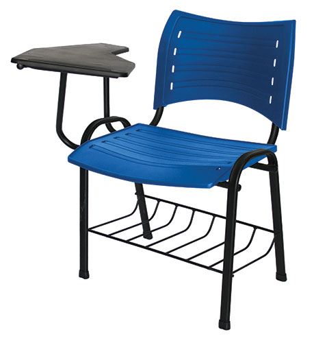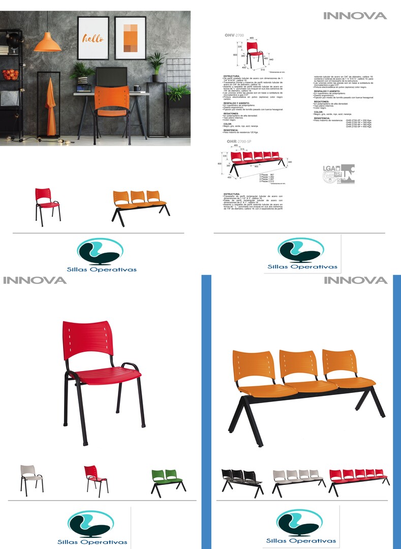 Estructura: de acero tubular ovalado de 30 x 15 mm, calibre 18; con acabado de pintura epóxica (electrostática) color negro mate. parrilla: en perfíl pulido redondo de acero en 3/16 "de diámetro. asiento y respaldo: en dos piezas en polipropileno de alta resistencia y duración, con diversas perforaciones en forma de óvalo. color: negro, gris, verde, rojo, azul o naranja.